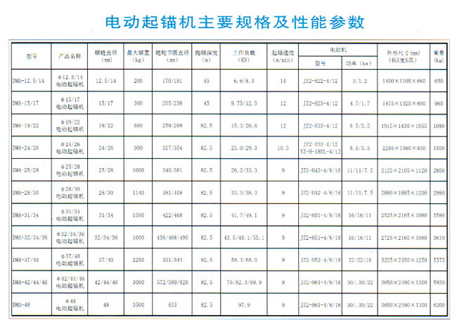以上每種規格起錨機都有單錨鏈輪和雙錨鏈輪型式,直徑25以下起錨機可帶人力起錨裝置,如用戶對性能參數和機構另有要求,本廠可按用戶要求進行設計和制造。